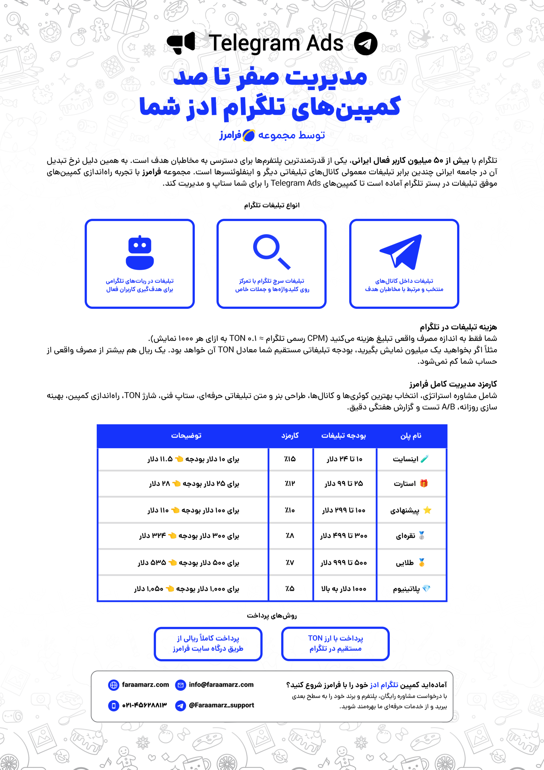 در فرامرز، پیش از ثبت نهایی سفارش تلگرام ادز، متن تبلیغ و ساختار کمپین بررسی میشود تا با قوانین تلگرام همخوانی داشته باشد و احتمال رد شدن تبلیغ به حداقل برسد. این موضوع باعث میشود روند اجرای تبلیغات برای کسب و کارها سریع تر و مطمئن تر انجام شود.